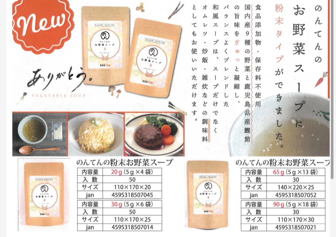 鹿児島のかつお節をベースに8種類のお野菜を使用した食品添加物・保存料不使用の粉末スープです。