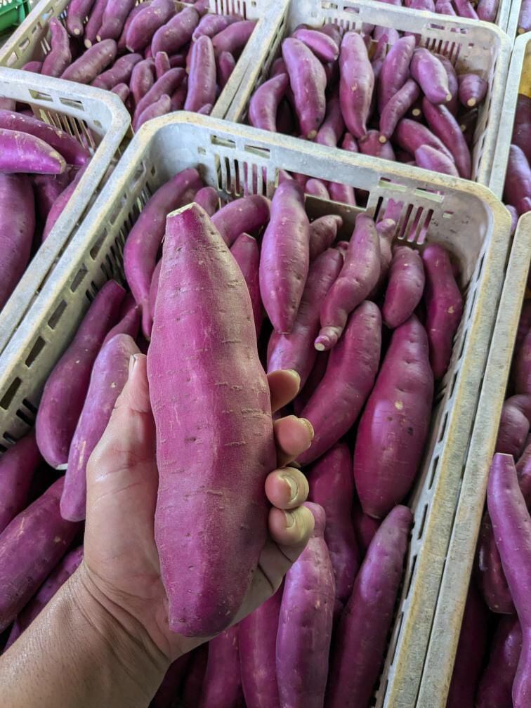 見た目は赤紫色、肉色はやや白っぽく、ほかのサツマイモと比べてヤラピン(整腸作用のある乳白色の液体)の含有率が高いです。